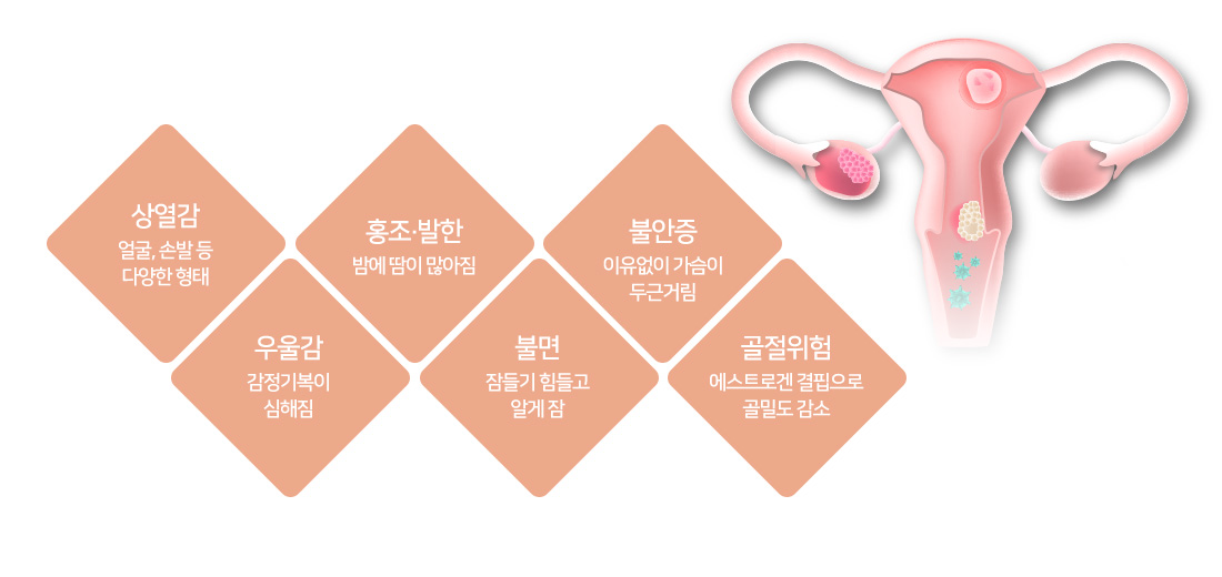 ÀϹÝÀûÀÎ °»³â±â´Â ¿©¼º È£¸£¸óÀÇ »ý»êÀÌ ÁÙ¾îµé¸é¼ ÀÚ¿¬½º·¹ °Þ°Ô µË´Ï´Ù. ÀϹÝÀûÀ¸·Î 40´ë ÁßÈĹݺÎÅÍ ½ÃÀ۵Ǹç, ¾È¸éÈ«Á¶, µÎ±Ù°Å¸², Çö±âÁõ, ºÒ¸é, À̸í, µÎÅë µîÀÌ °¡Àå ´ëÇ¥ÀûÀÎ Áõ»óÀÔ´Ï´Ù. Á¤¼ÀûÀÎ º¯È°¡ ÀÚÁÖ °üÂûµÇ¸ç, ¿øÀÎ ¸ð¸¦ ½Åü ÅëÁõ, ¼Òȱâ Àå¾Ö µîÀÇ Áõ»óÀÌ µ¿¹ÝµÉ ¼ö ÀÖ¾î, Á¤½Å°Ç°ÀÇ ¹üÁÖ¿¡¼ ÇÔ²² ´Ù·ç´Â °ÍÀÌ ÁÁ½À´Ï´Ù.